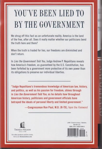 YOU’VE BEEN LIED TO BY THE GOVERNMENT We shrug off this fact as an unfortunate reality. America is the land of the free, after all. Does it really matter whether our politicians bend the truth here and there? When the truth is traded for lies, our freedoms are diminished and don’t return. In Lies the Government Told You, Judge Andrew P. Napolitano reveals how America’s freedom, as guaranteed by the U.S. Constitution, has been forfeited by a government more protective of its own power than its obligations to preserve our individual liberties. “Judge Napolitano’s tremendous knowledge of American law, history, and politics, as well as his passion for freedom, shines through in Lies the Government Told You, as he details how throughout American history, politicians and government officials have betrayed the ideals of personal liberty and limited government." —Congressman Ron Paul, M.D. (R-TX), from the Foreword