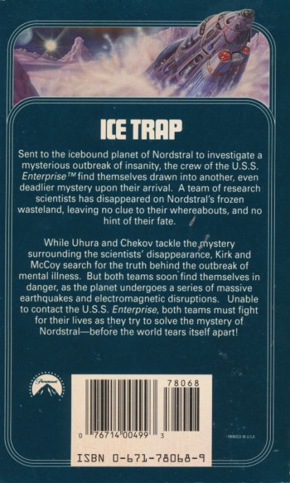 Sent to the icebound planet of Nordstral to investigate a mysterious outbreak of insanity, the crew of the U.S.S. Enterprise™ find themselves drawn into another, even deadlier mystery upon their arrival. A team of research scientists has disappeared on Nordstral's frozen wasteland, leaving no clue to their whereabouts, and no hint of their fate. WHile Uhura and Chekov tackle the mystery surrounding the scientists' disappearance, Kirk and McCoy search for the truth behind the outbreak of mental illness. But both teams soon find themselves in danger, as the planet undergoes a series of massive earthquakes and electromagnetic disruptions. Unable to contact he U.S.S. Enterprise, both teams must fight for their lives as they try to solve the mystery of Nordstral -- before the world tears itself apart!