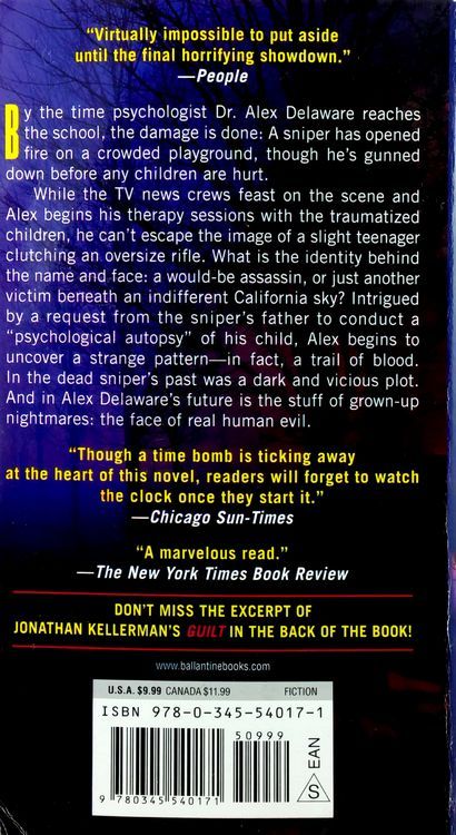 NEW YORK TIMES BESTSELLER By the time psychologist Dr. Alex Delaware reached the school the damage was done: A sniper had opened fire on a crowded playground, but was gunned down before any children were hurt. “Virtually impossible to put aside until the final horrifying showdown.”—People While the TV news crews feasted on the scene and Alex began his therapy sessions with the traumatized children, he couldn’t escape the image of a slight teenager clutching an oversized rifle. What was the identity behind the name and face: a would-be assassin, or just another victim beneath an indifferent California sky? Intrigued by a request from the sniper’s father to conduct a “psychological autopsy” of his child, Alex begins to uncover a strange pattern—it is a trail of blood. In the dead sniper’s past was a dark and vicious plot. And in Alex Delaware’s future is the stuff of grown-up nightmares: the face of real human evil.