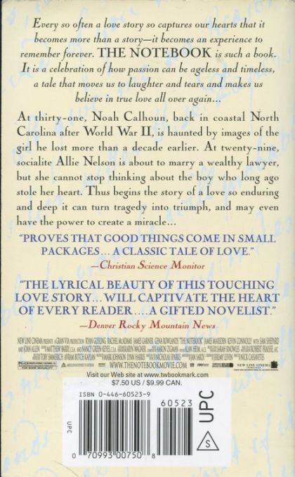 Experience the unforgettable, heartbreaking love story set in post-World War II North Carolina about a young socialite and the boy who once stole her heart -- one of PBS's "Great American Reads".Every so often a love story so captures our hearts that it becomes more than a story-it becomes an experience to remember forever. The Notebook is such a book. It is a celebration of how passion can be ageless and timeless, a tale that moves us to laughter and tears and makes us believe in true love all over again... At thirty-one, Noah Calhoun, back in coastal North Carolina after World War II, is haunted by images of the girl he lost more than a decade earlier. At twenty-nine, socialite Allie Nelson is about to marry a wealthy lawyer, but she cannot stop thinking about the boy who long ago stole her heart. Thus begins the story of a love so enduring and deep it can turn tragedy into triumph, and may even have the power to create a miracle...