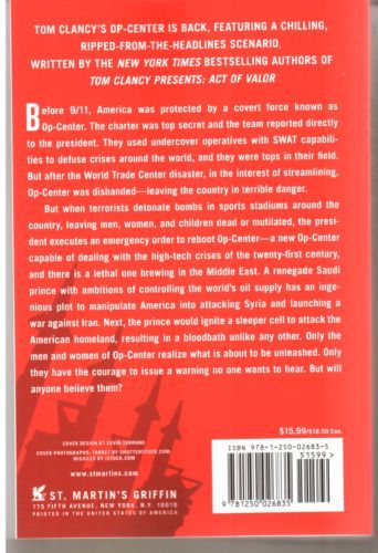 Tom Clancy's Op-Center is back with this new thriller written by the New York Times bestselling authors of Tom Clancy's ACT OF VALOR and featuring a chilling, ripped-from-the-headlines scenario.Before 9/11 America was protected by a covert force known as the National Crisis Management Center. Commonly known as Op-Center, this silent, secret mantel guarded the American people and protected the country from enemies. The charter was top secret and Director Paul Hood reported directly to the president. Op-Center used undercover operatives with SWAT capabilities to diffuse crises around the world, and they were tops in their field. But after the World Trade Center disaster, in the interest of streamlining, OP-Center was disbanded—leaving the country in terrible danger.But when terrorists detonate bombs in sports stadiums around the country leaving men, women and children dead or mutilated, the President executes an emergency order to bring back Op-Center—an Op-Center capable of dealing with the high tech crises of the 21st Century, and there is a lethal one brewing in the Middle East. A renegade Saudi Prince with ambitions of controlling the world's oil supply has an ingenious plot to manipulate America into attacking Syria and launching a war against Iran. Next, they would ignite a sleeper cell to attack the America homeland, resulting in a bloodbath unlike any other. Only the men and women of Op-Center, using sophisticated technology, realize what is about to be unleashed. Only they have the courage to issue a warning no one wants to hear. But will anyone believe them?