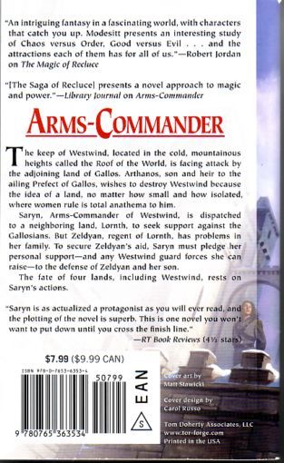 L.E. Modesitt, Jr.'s Arms-Commander continues his bestselling fantasy series the Saga of Recluce, which is one the most popular in contemporary epic fantasy.The keep of Westwind at the Roof of the World, faces attack by the adjoining land of Gallos. Arthanos, son and heir to the ailing Prefect of Gallos, wishes to destroy Westwind because the idea of a land where women rule is total anathema to him.Westwind dispatches Saryn, their Arms-Commander, a neighboring land to seek support against the Gallosians. To secure their aid, Saryn must pledge her personal support—and any Westwind guard forces she can raise—to the defense of its ruler.The fate of four lands, including Westwind, rest on Saryn's actions. “An intriguing fantasy in a fascinating world.”—Robert Jordan, New York Times bestselling author of The Wheel of Time® seriesSaga of Recluce#1 The Magic of Recluce / #2 The Towers of Sunset / #3 The Magic Engineer / #4 The Order War / #5 The Death of Chaos / #6 Fall of Angels / #7 The Chaos Balance / #8 The White Order / #9 Colors of Chaos / #10 Magi’i of Cyador / #11 Scion of Cyador / #12 Wellspring of Chaos / #13 Ordermaster / #14 Natural Order Mage / #15 Mage-Guard of Hamor / #16 Arms-Commander / #17 Cyador’s Heirs / #18 Heritage of Cyador /#19 The Mongrel Mage / #20 Outcasts of Order / #21 The Mage-Fire War (forthcoming)Story Collection: Recluce TalesOther Series by L.E. Modesitt, Jr.The Imager PortfolioThe Corean ChroniclesThe Spellsong CycleThe Ghost BooksThe Ecolitan Matter