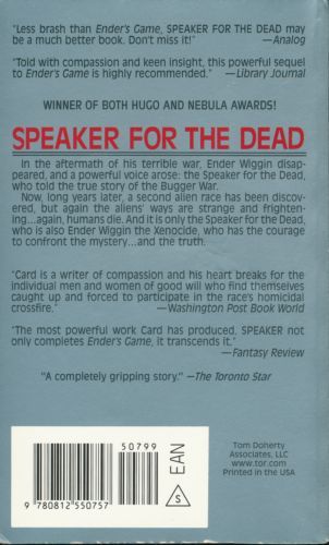 In the aftermath of his terrible war, Ender Wiggin disappeared, and a powerful voice arose: The Speaker for the Dead, who told the true story of the Bugger War.Now, long years later, a second alien race has been discovered, but again the aliens' ways are strange and frightening...again, humans die. And it is only the Speaker for the Dead, who is also Ender Wiggin the Xenocide, who has the courage to confront the mystery...and the truth.Speaker for the Dead, the second novel in Orson Scott Card's The Ender Saga, is the winner of the 1986 Nebula Award for Best Novel and the 1987 Hugo Award for Best Novel.THE ENDER UNIVERSEEnder seriesEnder’s Game / Ender in Exile / Speaker for the Dead / Xenocide / Children of the MindEnder’s Shadow seriesEnder’s Shadow / Shadow of the Hegemon / Shadow Puppets / Shadow of the Giant / Shadows in FlightChildren of the FleetThe First Formic War (with Aaron Johnston)Earth Unaware / Earth Afire / Earth AwakensThe Second Formic War (with Aaron Johnston)The Swarm /The HiveEnder novellasA War of Gifts /First Meetings