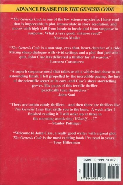 Mysterious assassinations. Cutting-edge medical technology. A secret organization with an unholy agenda. John Case has combined these intriguing elements into an explosive novel that will keep you up all night tuning the pages. THE GENESIS CODE builds momentum with fascinating characters, a breakneck chase, and then suddenly hits you right between the eyes with a shocking, unexpected climax. Joe Lassiter awakens to the ring of the phone in the dead of night. His sister and her young son have died in a blaze in their expensive home near Washington, D.C. Rushing to the scene, Lassiter learns the deaths were no accident: his sister and nephew were brutally murdered in their beds before the fire was set. The police are stumped, but Lassiter knows one thing: whoever killed his last living relatives provoked the wrong man. Lassiter heads a thriving high-tech investigative agency in the nation’s capital. If there’s a paper trail, he can follow it. A computer encryption, he can crack it. An identity to reveal, he will track it down. Now he’s got to uncover why an innocent mother and child were targeted for death. And this one is personal. There is a mysterious suspect. Discovering his identity only raises more questions. Then Lassiter uncovers another crime – another innocent mother and child murdered. The more he unearths, the larger the web of conspiracy grows. Every thread he pulls tightens the knot of deception. And as the link that connects the victims eludes him, he suspects that others may die very soon if he can’t find the truth – a search that will lead him into a dangerous international chase. And a truth that will shock him – and the reader – to his very marrow. (-book jacket)