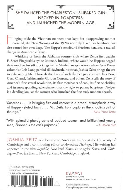 SHE DANCED THE CHARLESTON. SNEAKED GIN. NECKED IN ROADSTERS. AND LAUNCHED THE MODERN AGE. Flinging aside the Victorian manners that kept her disapproving mother corseted, the New Woman of the 1920s not only hiked her hemlines but also earned her own keep. The flapper’s newfound freedom heralded a radical change in American culture. Whisking us from the Alabama country club where Zelda first caught F. Scott Fitzgerald’s eye to Muncie, Indiana, where would-be flappers begged their mothers for silk stockings to the Manhattan speakeasies where New Yorker columnist Lois Long partied till daybreak, historian Joshua Zeitz brings the era to exhilarating life. Through the lives of such flapper pioneers as Clara Bow, Coco Chanel, fashion artist Gordon Conway, and others, Zeitz tells the story of America’s first sexual revolution, its first merchants of cool, its first celebrities, and its most sparkling advertisement for the right to pursue happiness. “Flapper” is a dazzling look at the women who launched the first truly modern decade. About the Author____________________ Joshua Zeitz is a lecturer on American history at the University of Cambridge and a contributing editor to American Heritage. His writing has appeared in the New Republic, the New York Times, the Los Angeles Times, and the Washington Post. He lives in New York and in Cambridge, England.