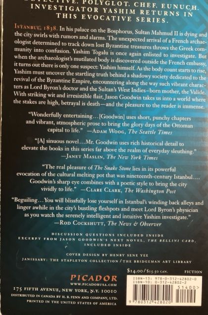 Detective, polyglot, chef, eunuch--Investigator Yashim returns in this evocative Edgar® Award–winning series set in Istanbul at the end of the Ottoman EmpireIstanbul, 1838. In his palace on the Bosphorus, Sultan Mahmud II is dying and the city swirls with rumors and alarms. The unexpected arrival of a French archaeologist determined to track down lost Byzantine treasures throws the Greek community into confusion. Yashim Togalu is once again enlisted to investigate. But when the archaeologist's mutilated body is discovered outside the French embassy, it turns out there is only one suspect: Yashim himself. As the body count starts to rise, Yashim must uncover the startling truth behind a shadowy society dedicated to the revival of the Byzantine Empire, encountering along the way such vibrant characters as Lord Byron's doctor and the Sultan's West Indies–born mother, the Valide. With striking wit and irresistible flair, Jason Goodwin takes us into a world where the stakes are high, betrayal is death--and the pleasure to the reader is immense.