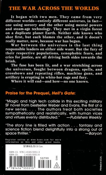 It began with two men. They came from very different worlds—entirely different universes, in fact—one using sorcery and the other using mental powers and steam-age technology. They met in a virgin forest on a duplicate planet Earth. Neither side knows who shot first, but each blames the other, and it doesn't really matter, now, because war has begun. War between the universes is the last thing responsible leaders on either side want. But the fury of their respective populations, xenophobic fear of the unknown, and cries for "justice" (or vengeance), are all driving both sides towards the brink. And unscrupulous, power-hungry men—and Arcana and Sharona alike—have agendas of their own. The fuse has been lit, and a war stretching across the universes, fought between dragons, spells, and crossbows and repeating rifles, machine guns, and artillery is erupting in white-hot rage and fury. Where it will end—and how—no one knows