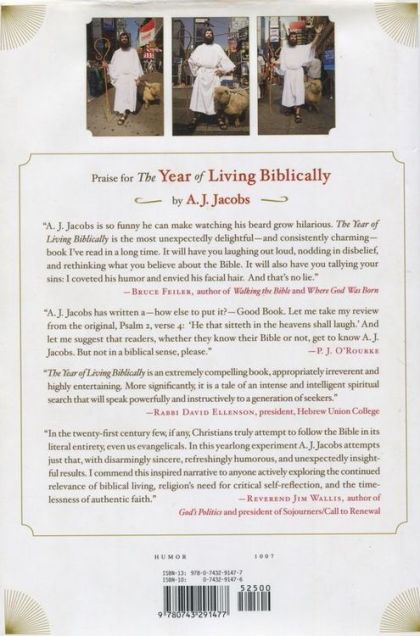 Raised in a secular family but increasingly interested in the relevance of faith in our modern world, A.J. Jacobs decides to dive in headfirst and attempt to obey the Bible as literally as possible for one full year. He vows to follow the Ten Commandments. To be fruitful and multiply. To love his neighbor. But also to obey the hundreds of less publicized rules: to avoid wearing clothes made of mixed fibers; to play a ten-string harp; to stone adulterers. The resulting spiritual journey is at once funny and profound, reverent and irreverent, personal and universal and will make you see history's most influential book with new eyes. Jacobs's quest transforms his life even more radically than the year spent reading the entire ENCYCLOPEDIA BRITANNICA for THE KNOW-IT-ALL. His beard grows so unruly that he is regularly mistaken for a member of ZZ Top. He immerses himself in prayer, tends sheep in the Israeli desert, battles idolatry, and tells the absolute truth in all situations - much to his wife's chagrin. Throughout the book, Jacobs also embeds himself in a cross-section of communities that take the Bible literally. He tours a Kentucky-based creationist museum and sings hymns with Pennsylvania Amish. He dances with Hasidic Jews in Brooklyn and does Scripture study with Jehovah's Witnesses. He discovers ancient biblical wisdom of startling relevance. And he wrestles with seemingly archaic rules that baffle the twenty-first-century brain. Jacobs's extraordinary undertaking yields unexpected epiphanies and challenges. A book that will charm readers both secular and religious, THE YEAR OF LIVING BIBLICALLY is part Cliff Notes to the Bible, part memoir, and part look into worlds unimaginable. Thou shalt not be able to put it down. (-book jacket)