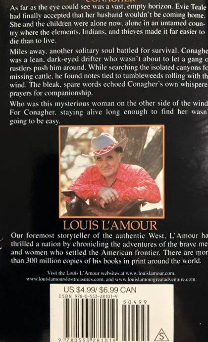 As far as the eye can see is a vast, empty horizon. Evie Teale has finally accepted that her husband won’t be coming home. To make ends meet she runs a temporary stage station. But though she is diligent and careful, Evie must prepare for the day when the passengers no longer come and she must protect her children in an untamed country where’s it’s far easier to die than to live. Miles away, another solitary soul battles for survival. Conagher is a lean, dark-eyed drifter who is not about to let a gang of rustlers push him around. While searching the isolated canyons for missing cattle, he finds notes tied to tumbleweeds rolling with the wind. The bleak, spare words echo Conagher’s own whispered prayers for companionship. Who is this mysterious woman on the other side of the wind? Conagher only hopes he can stay alive long enough to find her.