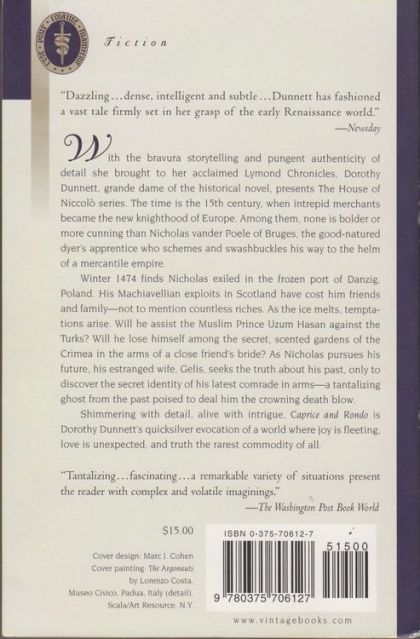Caprice and Rondo (1997) 1474-1476. Set largely in Italy, Poland, the Crimea, Persia, Russia, and Flanders/Burgundy. "Winter, 1474: In the frozen port of Danzig, Nicholas de Fleury, one-time soldier, merchant, and banker to kings, leads his raffish companions on frivolous, drunken adventures that give little indication of the dark and complex events that have brought him among them - his activities as a spy; his shifts of allegiance from the Duke of Burgundy to the Holy Roman Emperor, and back; the mischief-making at the court of Scotland so vicious that his disgusted friends cast him into justifiable exile.". The volumes are as follows: Niccolò Rising (1986) Spring of the Ram (1987) Race of Scorpions (1989) Scales of Gold (1991) The Unicorn Hunt (1993) To Lie with Lions (1995) Caprice and Rondo (1997) Gemini (2000)