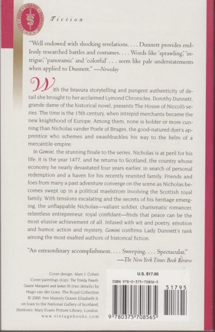 Scotland, 1477: Nicholas de Fleury, former banker and merchant, has re-appeared in the land that, four years earlier, he had brought very close to ruin in the course of an intense commercial and personal war with secret enemies--and, indeed, with his clever wife Gelis.Now the opportunity for redemption is at hand, but Nicholas soon finds himself pursuing his objectives amid a complex, corrosive power struggle centering on the Scottish royal family but closely involving the powerful merchants of Edinburgh, the gentry, the clergy, the English (ever seeking an excuse to pounce on their neighbor to the north), the French, the Burgundians. His presence soon draws Gelis and their son Jodi to Scotland, as well as Nicholas's companions and subordinates in many a past endeavor--Dr. Tobias and his wife Clémence, Mick Crackbene, John le Grant, and Andro Wodman among them. Here, too, Nicholas meets again with others who have had an influence, for good or evil, in his life: King James III of Scotland and his rebellious siblings; the St. Pols: Jordan, Simon, and young Henry; Mistress Bel of Cuthilgurdy and David de Salmeton; Anselm Adorne and Kathi his niece. Caught up in, and sometimes molding, the course of great events, Nicholas exhibits by turns the fierce silence with which he masks his secrets, and the explosive, willful gaiety that binds men, women, and children to him. And as the secrets of his birth and heritage come to light, Nicholas has to decide whether he desires to establish a future in Scotland for himself and his family, and a home for his descendants.Gemini brings to a dazzling conclusion Dorothy Dunnett's House of Niccolò series (synopsized in this volume), in which this peerless novelist has vividly re-created the dramatic, flamboyant world of the early Renaissance in historical writing of scrupulous authenticity and in the entrancing portrait of her visionary hero. Now, in a book infused with wit and poetry, emotion and humor, action and mystery, she brings Nicholas de Fleury at last to choose his heart's home, where he can exercise all his skills as an advisor to kings and statesmen, as a husband, a father, and a leader of men--and where, perhaps, we will discern a connection between him and that other remarkable personality, Francis Crawford, whose exploits Lady Dunnett recorded so memorably in The Lymond Chronicles. The volumes are as follows: Niccolò Rising (1986) Spring of the Ram (1987) Race of Scorpions (1989) Scales of Gold (1991) The Unicorn Hunt (1993) To Lie with Lions (1995) Caprice and Rondo (1997) Gemini (2000)
