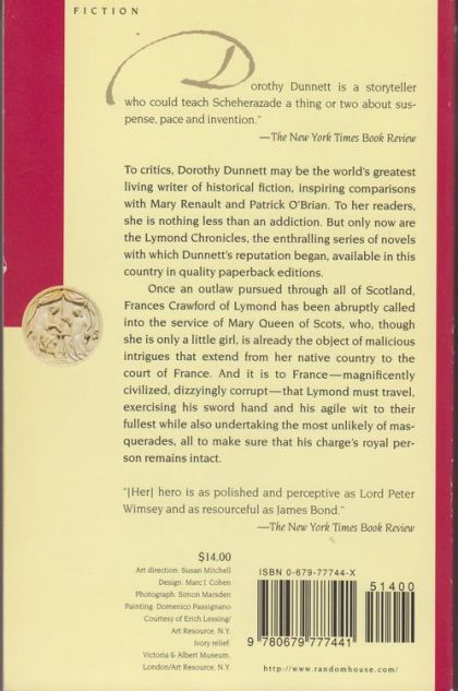 For the first time Dunnett's Lymond Chronicles are available in the United States in quality paperback editions. Second in the legendary Lymond Chronicles, Queen's Play follows Frances Crawford of Lymond who has been abruptly called into the service of Mary Queen of Scots. Though she is only a little girl, the Queen is already the object of malicious intrigues that extend from her native country to the court of France. It is to France that Lymond must travel, exercising his sword hand and his agile wit while also undertaking the most unlikely of masquerades, all to make sure that his charge's royal person stays intact. The six novels in the series are as follows: The Game of Kings (1961) Queens' Play (1964) The Disorderly Knights (1966) Pawn in Frankincense (1969) The Ringed Castle (1971) Checkmate (1975) Queens' Play (1964) Having cleared his name in Scotland, Lymond takes on an unlikely alias in order to infiltrate the French Court and protect the young Mary, Queen of Scots from her would-be assassins, but in the whirl and rush of Europe's most decadent and reckless Court, he finds it increasingly difficult to remember where play-acting ends and self-destructive excess begins. Main fictional characters Francis Crawford of Lymond, Master of Culter Sybilla Crawford, Dowager Baroness Culter Richard Crawford, Third Baron Culter Phelim O'Liam Roe, Irish leader Oonagh O'Dwyer, Mistress of Cormac O'Connor Archie Abernethy, Elephant Keeper Main historical characters Mary de Guise, Queen Dowager of Scotland Margaret Erskine Jenny Fleming, Mistress of the King of France George Douglas, exiled Scot, living in France Cormac O'Connor, claimant to the Irish throne Main locations Paris, France Blois, France London, England Falkland Palace, Scotland