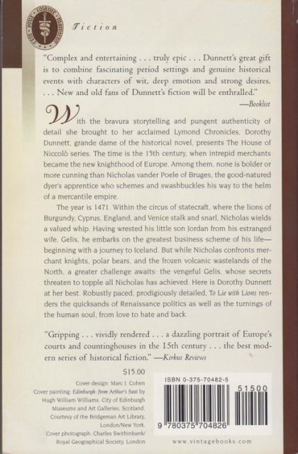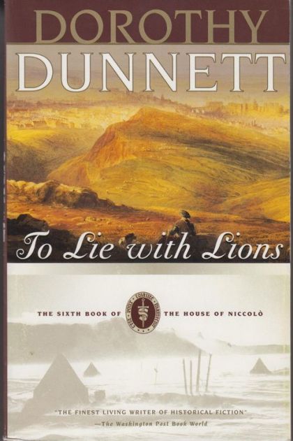 "The year is 1471; the time, the dawn of the modern era and the Age of Exploration; the location, both the palaces and the wild places of Europe; and the man, Nicholas de Fleury - a former dyer's apprentice whose innate qualities of intelligence, audacity, and determination have propelled him to the very summit of economic power and political influence.". The year is 1471. Within the circus of statecraft, where the lions of Burgundy, Cyprus, England, and Venice stalk and snarl, Nicholas wields a valued whip. Having wrested his little son Jordan from his estranged wife, Gelis, he embarks on the greatest business scheme of his life-- beginning with a journey to Iceland. But while Nicholas confronts merchant knights, polar bears, and the frozen volcanic wastelands of the North, a greater challenge awaits: the vengeful Gelis, whose secrets threaten to topple all Nicholas has achieved. Here is Dorothy Dunnett at her best. Robustly paced, prodigiously detailed, To Lie with Lions renders the quicksands of Renaissance politics as well as the turnings of the human soul, from love to hate and back. The volumes are as follows: Niccolò Rising (1986) Spring of the Ram (1987) Race of Scorpions (1989) Scales of Gold (1991) The Unicorn Hunt (1993) To Lie with Lions (1995) Caprice and Rondo (1997) Gemini (2000)