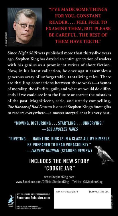 Now in a mass-market paperback premium edition—the instant #1 New York Times bestseller! Stephen King delivers an “outstanding” (USA TODAY) collection of stories, featuring revelatory autobiographical comments on when, why, and how he came to write (or rewrite) each story. “I’ve made some things for you, Constant Reader. …Feel free to examine them, but please be careful. The best of them have teeth.” Since Nightshift, published thirty-five years ago, Stephen King has dazzled an entire generation of readers with his genius as a prominent writer of short fiction. Now in his latest collection, he once again assembles a generous array of unforgettable, tantalizing tales—including those that, until recently, have never been published in a book (such as the story “Cookie Jar,” which is exclusive to this edition). There are thrilling connections between these works—themes of mortality, the afterlife, guilt, and what we would do differently if we could see into the future or correct the mistakes of the past. Magnificent, eerie, and utterly compelling, The Bazaar of Bad Dreams is one of Stephen King’s finest gifts to readers everywhere—a master storyteller at his very best.