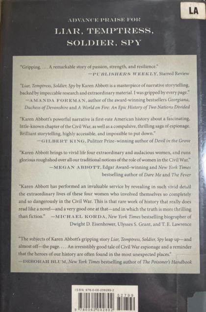 Review of: “Liar Temptress Soldier Spy: Four Women Undercover in the Civil War,” by Karen Abbott https://regarp.com/2020/12/31/review-of-liar-temptress-soldier-spy-four-women-undercover-in-the-civil-war-by-karen-abbott/