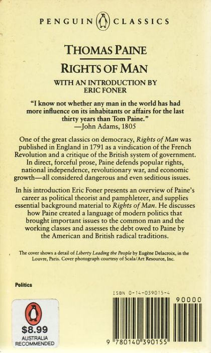 One of the great classics on democracy, Rights of Man was published in England in 1791 as a vindication of the French Revolution and a critique of the British system of government. In direct, forceful prose, Paine defends popular rights, national independence, revolutionary war, and economic growth—all considered dangerous and even seditious issues. In his introduction Eric Foner presents an overview of Paine's career as political theorist and pamphleteer, and supplies essential background material to Rights of Man. He discusses how Paine created a language of modern politics that brought important issues to the common man and the working classes and assesses the debt owed to Paine by the American and British radical traditions.For more than seventy years, Penguin has been the leading publisher of classic literature in the English-speaking world. With more than 1,700 titles, Penguin Classics represents a global bookshelf of the best works throughout history and across genres and disciplines. Readers trust the series to provide authoritative texts enhanced by introductions and notes by distinguished scholars and contemporary authors, as well as up-to-date translations by award-winning translators.