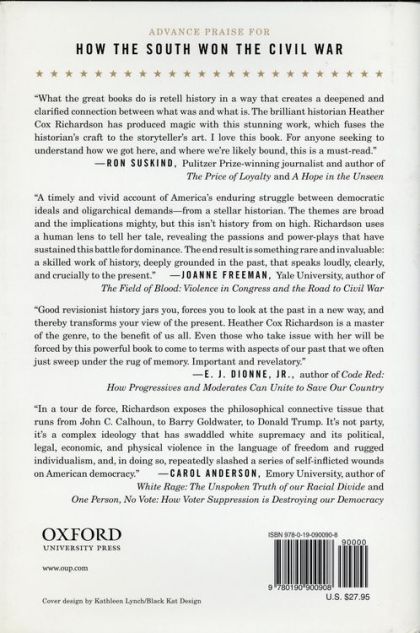Named one of The Washington Post's 50 Notable Works of Nonfiction While the North prevailed in the Civil War, ending slavery and giving the country a "new birth of freedom," Heather Cox Richardson argues in this provocative work that democracy's blood-soaked victory was ephemeral. The system that had sustained the defeated South moved westward and there established a foothold. It was a natural fit. Settlers from the East had for decades been pushing into the West, where the seizure of Mexican lands at the end of the Mexican-American War and treatment of Native Americans cemented racial hierarchies. The South and West equally depended on extractive industries-cotton in the former and mining, cattle, and oil in the latter-giving rise a new birth of white male oligarchy, despite the guarantees provided by the 13th, 14th, and 15th Amendments, and the economic opportunities afforded by expansion. To reveal why this happened, How the South Won the Civil War traces the story of the American paradox, the competing claims of equality and subordination woven into the nation's fabric and identity. At the nation's founding, it was the Eastern "yeoman farmer" who galvanized and symbolized the American Revolution. After the Civil War, that mantle was assumed by the Western cowboy, singlehandedly defending his land against barbarians and savages as well as from a rapacious government. New states entered the Union in the late nineteenth century and western and southern leaders found yet more common ground. As resources and people streamed into the West during the New Deal and World War II, the region's influence grew. "Movement Conservatives," led by westerners Barry Goldwater, Richard Nixon, and Ronald Reagan, claimed to embody cowboy individualism and worked with Dixiecrats to embrace the ideology of the Confederacy. Richardson's searing book seizes upon the soul of the country and its ongoing struggle to provide equal opportunity to all. Debunking the myth that the Civil War released the nation from the grip of oligarchy, expunging the sins of the Founding, it reveals how and why the Old South not only survived in the West, but thrived.