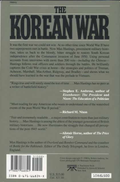It was the first war we could not win. At no other time since World War II have two superpowers met in battle.Max Hastings—preeminent military historian—takes us back to the bloody bitter struggle to restore South Korean independence after the Communist invasion of June 1950. Using personal accounts from interviews with more than two-hundred vets—including the Chinese—Hastings follows real officers and soldiers through the battles. He brilliantly captures the Cold War crisis at home—the strategies and politics of Truman, Acheson, Marshall, MacArthur, Ridgway, and Bradley—and shows what we should have learned in the war that was the prelude to Vietnam.