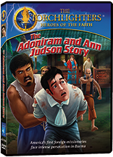 “Follow the extraordinary adventures of Adoniram Judson and his wife Ann, the first foreign missionaries from the United States. Having been turned away from India, the young couple sets out for Burma where they work to reach souls in a land where professing Christ would mean certain death. When treacherous religious leaders falsely accuse Adoniram of spying, Burma’s ruthless king throws him into prison, leaving Ann and her unborn child to struggle alone. Will Adoniram escape death and reunite with his wife and child? Will their Bible translation, the only one of its kind, be lost forever? Find out in this episode of The Torchlighters.”