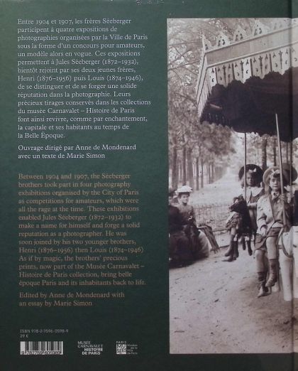 "Entre 1904 et 1907, les frères Séeberger participent à quatre expositions de photographies organisées par la Ville de Paris sous la forme d'un concours pour amateurs, un modèle alors en vogue. Ces expositions permettent à Jules Séeberger (1872-1932), bientôt rejoint par ses deux jeunes frères, Henri (1876-1956) puis Louis (1874-1946), de se distinguer et de se forger une solide réputation dans la photographie. Leurs précieux tirages conservés dans les collections du musée Carnavalet - Histoire de Paris font ainsi revivre, comme par enchantement, la capitale et ses habitants au temps de la Belle Époque."--Page 4 of cover.