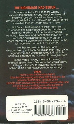 A fabulous journey through the mind of the master of dark imaginative fiction, Clive Barker. The nightmare had begun.... Boone knew that there was no place on this earth for him now; no happiness here, not even with Lori. He would let Hell claim him, let Death take him there. But Death itself seemed to shrink from Boone. No wonder, if he had indeed been the monster who had shattered, violated and shredded so many others' lives. And Decker had shown him the proof - the hellish photographs where the last victims were forever stilled, splayed in the last obscene moment of their torture. Boone's only refuge now was Midian - that awful, legendary place in which gathered the half-dead, the Nightbreed...