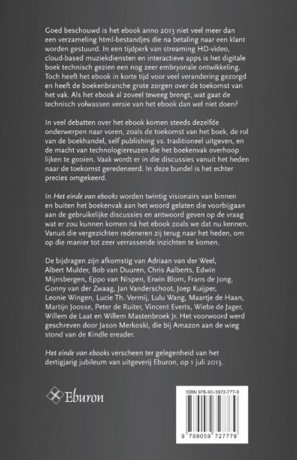 In een tijdperk van streaming HD-video, cloud-based muziekdiensten en interactieve apps is het digitale boek technisch gezien een nog zeer embryonale ontwikkeling. Toch heeft het ebook in korte tijd voor veel verandering gezorgd en heeft de boekenbranche grote zorgen over de toekomst van het vak. Als het ebook al zoveel teweeg brengt, wat gaat de technisch volwassen versie van het ebook dan wel niet doen? In veel debatten over het ebook komen steeds dezelfde onderwerpen naar voren, zoals de toekomst van het boek, de rol van de boekhandel, self publishing vs. traditioneel uitgeven, en de macht van technologiereuzen die het boekenvak overhoop lijken te gooien. Vaak wordt er in die discussies vanuit het heden naar de toekomst geredeneerd. In deze bundel is het echter precies omgekeerd. In 'Het einde van ebooks' worden twintig visionairs van binnen en buiten het boekenvak aan het woord gelaten die voorbijgaan aan de gebruikelijke discussies en antwoord geven op de vraag wat er zou kunnen komen ná het ebook zoals we dat nu kennen.