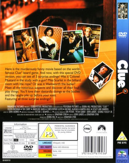 Clue finds six colorful dinner guests gathered at the mansion of their host, Mr. Boddy -- who turns up dead after his secret is exposed: He was blackmailing all of them. With the killer among them, the guests and Boddy's chatty butler must suss out the culprit before the body count rises.