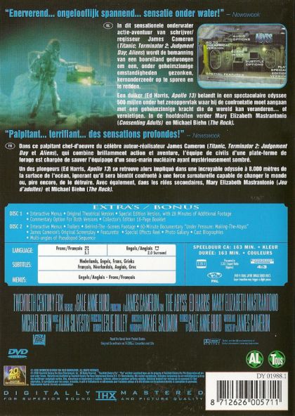 A civilian oil rig crew is recruited to conduct a search and rescue effort when a nuclear submarine mysteriously sinks. One diver soon finds himself on a spectacular odyssey 25,000 feet below the ocean's surface where he confronts a mysterious force that has the power to change the world or destroy it.