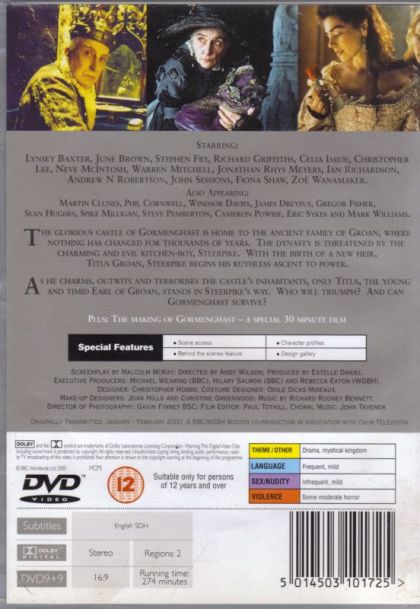 A four-episode television serial based on the Gormenghast series by Mervyn Peake. It was produced and broadcast by the BBC. Gormenghast is an ancient city-state which primarily consists of a rambling and crumbling castle. The narrative, based on the first two of the three Gormenghast novels by Mervyn Peake, begins with the birth of a son, Titus, to the 76th Earl, Sepulchrave Groan, and Countess Gertrude. This mismatched pair (he'd prefer the melancholy privacy of his library; she'd prefer the company of her menagerie of cats and birds) also have a teenaged daughter, Fuchsia, who resents her new brother but comes to love him dearly. Simultaneously, a young kitchen apprentice, Steerpike, takes advantage of an altercation between head cook Swelter and the Earl's manservant, Mr. Flay, and escapes from the kitchens. Gormenghast is rigidly feudal in structure, but Steerpike has ambitions.