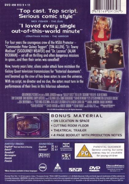 For four years, the courageous crew of the NSEA Protector — Commander Peter Quincy Taggart, Lieutenant Tawny Madison, and Doctor Lazarus — set off on a thrilling and often dangerous mission in space ... until their series was cancelled! Now, twenty years later, aliens under attack have mistaken the Galaxy Quest television transmissions for "historical documents" and beam up the crew of has-been actors to save the universe. With no script, no director, and no clue, the actors must turn in the performances of their lives.