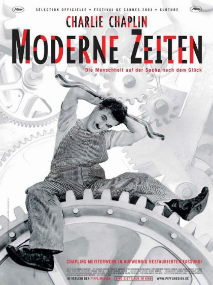Wie eine Schafherde, dicht an dicht, drängen die Arbeiter aus der U-Bahn in die Fabrik. Einer von ihnen ist Charlie, der Tramp. In der Fabrik sind absurde Maschinen zu bedienen und ständig überwacht der Fabrikdirektor mit Kameras und Bildschirmen die Tätigkeit seiner Mitarbeiter. Charlie arbeitet in der Fließbandfertigung, er schraubt und schraubt und schraubt.