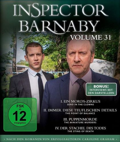DISC I : EIN MORDS-ZIRKUS SEND IN THE CLOWNS - 89 MINFerrabees Zirkus gastiert in der Stadt. Als sich Sichtungen eines Horror-Clowns und tödliche Zirkus-Kunststücke häufen, nehmen die Dinge allerdings eine grausame Wendung. Für Joe Ferrabbee ist das eine Katastrophe, steht sein Zirkus doch ohnehin schon kurz vor dem Bankrott. Will ihn jemand finanziell ruinieren? Als eine weitere Zirkusnummer tödlich endet, müssen sich Inspector Barnaby und DS Jamie Winter sputen, um weitere Morde zu verhindern.DISC I : IMMER DIESE TEUFLISCHEN DETAILSTHE POINT OF BALANCE - 89 MINIn Midsomer herrscht große Aufregung wegen des bevorstehenden Tanzwettbewerbs. Doch hinter dem Lächeln der Tänzer verbergen sich tiefe Fehden. Als die Journalistin Rosa Corrigan ermordet in ihrem Haus gefunden wird, kommt dieser Fall für Barnaby gerade recht, denn sein Vater Ned hat sich bei ihm einquartiert. Da sucht Barnaby lieber sehr gründlich nach möglichen Mordmotiven. Ausgerechnet Ned lenkt Johns Blick dann auf das entscheidende teuflische, kleine Detail.DISC II : PUPPENMORDETHE MINIATURE MURDERS - 89 MINDer schwerreiche Immobilienbesitzer Alexander Beauvoisin wird bei einer Veranstaltung zugunsten des Puppenhaus-Museums erschossen. Ein Hauptverdächtiger ist schnell gefunden: Beauvoisins ehemaliger Gebäudemanager Wesley Peters, der kurz zuvor aus der Haft entlassen wurde. Wollte er sich an seinem Ex-Boss rächen? Während der Ermittlungen machen sich aber noch weiterer Personen äußerst verdächtig. Für DCI Barnaby und DS Winter gilt es noch viel herauszufinden, bis der wahre Täter überführt werden kann.DISC II : DER STACHEL DES TODESTHE STING OF DEATH - 89 MINEin bizarrer Mord ruft Inspector Barnaby und DS Winter auf den Plan: Dr. Serena Lowe wurde niedergeschlagen, mit einem Bienen-Lockmittel eingerieben und erstickte schließlich an einem geschwollenen Bienenstich. An Tatverdächtigen herrscht kein Mangel. Doch noch bevor John Barnaby und sein Assistent tiefer in die stacheligen Verstrickungen eintauchen können, geschieht der nächste Mord – begangen mit reinem Bienengift.