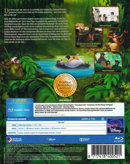 The Jungle Book follows the ups and downs of the man-cub Mowgli as he makes his way back to the human village with wise panther Bagheera to escape ruthless tiger Shere Khan. Along the way, he meets unforgettable friends and foes including mad King Louie of the Apes, the hypnotic snake Kaa and the loveable, happy-go-lucky bear Baloo, who teaches Mowgli about true friendship.