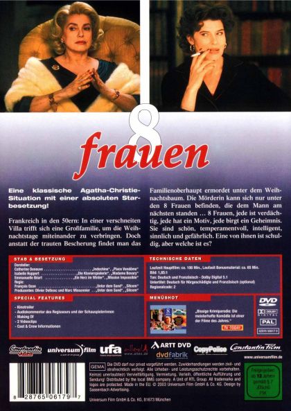 Eine klassische Agatha-Christie-Situation mit einer absoluten Starbesetzung!Frankreich in den 50ern: In einer verschneiten Villa trifft sich eine Großfamilie, um die Weihnachtstage miteinander zu verbringen. Doch anstatt der trauten Bescherung findet man das Familienoberhaupt ermordet unter dem Weihnachtsbaum. Die Mörderin kann sich nur unter den 8 Frauen befinden, die dem Mann am nächsten standen ... 8 Frauen, jede ist verdächtig, jede hat ein Motiv, jede birgt ein Geheimnis. Sie sind schön, temperamentvoll, intelligent, sinnlich und gefährlich. Eine von ihnen ist schuldig, aber welche ist es?