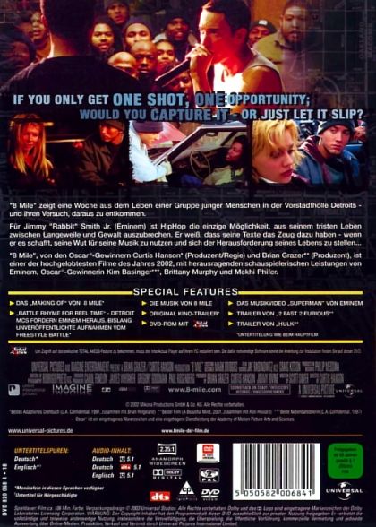 "8 Mile" zeigt eine Woche aus dem Leben einer Gruppe junger Menschen in der Vorstadthölle Detroits - und ihren Versuch, daraus zu entkommen.Für Jimmy "Rabbit" Smith jr. (Eminem) ist HipHop die einzige Möglichkeit, aus seinem tristen Leben zwischen Langeweile und Gewalt auszubrechen. Er weiß, dass seine Texte das Zeug dazu haben - wenn er es schafft, seine Wut für seine Musik zu nutzen und sich der Herausforderung seines Lebens zu stellen..."8 Mile", von den Oscar-Gewinnern Curtis Hanson (Produzent/Regie) und Brian Grazer (Produzent), ist einer der hochgelobtesten Filme des Jahres 2002, mit herausragenden schauspielerischen Leistungen von Eminem, Oscar-Gewinnerein Kim Basinger, Brittany Murphy und Mekhi Phifer.