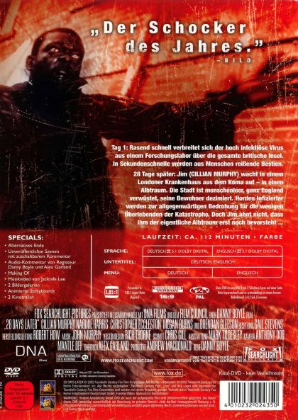 Tag 1: Rasend schnell verbreitet sich der hoch infektiöse Virus aus einem Forschungslabor über die gesamte britische Insel. In Sekundenschnelle werden aus Menschen reißende Bestien.28 Tage später: Jim (CILLIAN MURPHY) wacht in einem Londoner Krankenhaus aus dem Koma auf - in einen Albtraum. Die Stadt ist menschenleer, ganz England verwüstet, seine Bewohner dezimiert. Horden Infizierter werden zur allgegenwärtigen Bedrohung für die wenigen Überlebenden der Katastrophe. Doch Jim ahnt nicht, dass ihm der eigentliche Albtraum erst noch bevorsteht ...