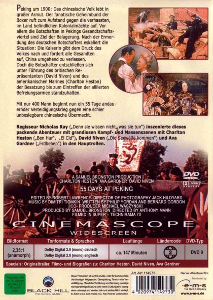 Peking um 1900: Das chinesische Volk lebt in großer Armut. Der fanatische Geheimbund der Boxer ruft zum Aufstand gegen die verhassten, im Land befindlichen Kolonialmächte auf. Vor allem die Botschaften in Pekings Gesandtschaftsviertel sind Ziel der Belagerung. Nach der Ermordung des Deutschen Botschafters eskaliert die Situation. Die Kaiserin gibt den Druck des Volkes nach und fordert alle Gesandten auf, China umgehend zu verlassen. Doch die Botschafter entschließen sich unter Führung des britischen Repräsentanten (David Niven) und des amerikanischen Marines (Charlton Heston) der Besatzung bis zum Eintreffen der alliierten Befreiungsarmee.