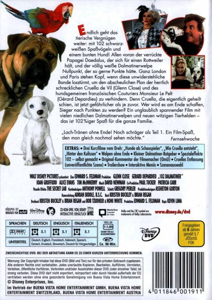 Endlich geht das tierische Vergnügen weiter: mit 102 schwarz-weißen Spaßvögeln und einem bunten Hund! Allen voran der verrückte Papagei Daedalus, der sich für einen Rottweiler hält, und der völlig weiße Dalmatinerwelpe Nullpunkt, der so gerne Punkte hätte. Ganz London und Paris stehen Kopf, wenn diese unwiderstehliche Bande losstürmt, um den abscheulichen Plan der herrlich schrecklichen Cruella de Vil (Glenn Close) und des hundsgemeinen französischen Couturiers Monsieur Le Pelt (Gérard Depardieu) zu verhindern. Denn Cruella, die eigentlich geheilt schien, ist geföhrlicher als je zuvor. Wer wird es am Ende schaffen, Sieger nach Punkten zu werden? Ein unglaublich spannender Film mit vielen niedlichen Dalmatinerwelpen und neuen witzigen Tierhelden - das ist 102%iger Spaß für die ganze Familie.