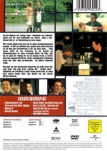 Von den Machern von "Bridget Jones - Schokolade zum Frühstück" kommt jetzt der neue Komödienhit des Jahres: "About a Boy". Diesmal geht es zur Abwechslung um einen Jungen.Will Freeman (Hugh Grant) wird von all seinen Geschlechtsgenossen beneidet - er fährt ein schnelles Auto, genießt seine Affären und kann mit 38 ohne jede Verantwortung in den Tag hinein leben... Seine neuste Taktik für den Frauenfang ist der Besuch von Selbsthilfegruppen für allein erziehende Mütter und Väter, denn das ist genau der richtige Ort um auf einsame Frauen zu treffen. Doch dann begegnet Will Marcus. Dieser ungewöhnliche Zwölfjährige bringt sein Leben völlig durcheinander - mit äußerst amüsanten Folgen.Untermalt von dem fantastischen Soundtrack von Bradly Drawn Boy, zeigt dieser Film Hugh Grant ("Notting Hill", "Bridget Jones - Schokolade zum Frühstück") in seiner bislang besten Rolle. An seiner Seite spielen Rachel Weisz ("Die Mumie") und Toni Collette ("Muriels Hochzeit").