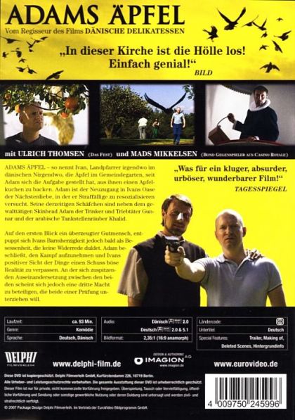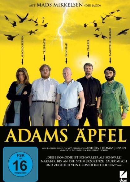 ADAMS ÄPFEL - so nennt Ivan, Landpfarrer irgendwo im dänischen Nirgendwo, die Äpfel im Gemeindegarten, seit Adam sich die Aufgabe gestellt hat, aus ihnen einen Apfelkuchen zu backen. Adam ist der Neuzugang in Ivans Oase der Nächstenliebe, in der er Straffällige zu resozialisieren versucht. Seine derzeitigen Schäfchen sind neben dem gewalttätigen Skinhead Adam der Trinker und Triebtäter Gunnar und der arabische Tankstellenräuber Khalid.Auf den ersten Blick ein überzeugter Gutmensch, entpuppt sich Ivans Barmherzigkeit jedoch bald als Besessenheit, die keine Widerrede duldet. Adam beschließt, den Kampf aufzunehmen und Ivans positiver Sicht der Dinge einen Schuss böse Realität zu verpassen. An der sich zuspitzenden Auseinandersetzung zwischen den beiden scheint sich jedoch eine dritte Macht zu beteiligen, die beide einer Prüfung unterziehen will.