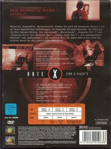 Neue Wahrheiten werden enthüllt...Mysteriös. Unglaublich. Nervenzerrend. Erleben Sie jetzt die komplette Season 4 mit all ihren bedrohlichen Enthüllungen. 24 fesselnde Episoden-Klassiker als exklusive 7er-Disc Sammel-Edition. Von "Herrenvolk", "Blutschande", "Tunguska - Teil 1" und "Tunguska - Teil 2" bis "Memento Mori", "Tempus Fugit - Teil 2", "Ein unbedeutender Niemand" und "Gethsemane" - ein absolutes Muss für jeden Akte X-Fan! Sind Sie wirklich bereit für die schockierende Wahrheit?DISC 1:Herrenvolk (Herrenvolk) Blutschande (Home) Teliko (Teliko) Unruhe (Unruhe) DISC 2:Rückkehr der Seelen (The field where I died) Hexensabbat (Sanguinarium) Gedanken des geheimnisvollen Rauchers (Musings of a Cigarette Smoking Man) Tunguska - Teil 1 (Tunguska) DISC 3:Tunguska - Teil 2 (Terma) Die Sammlung (Paper Hearts) Der Chupacabra (El Mundo Gira) Leonard Betts (Leonard Betts) DISC 4:Mutterkorn (Never Again) Memento Mori (Memento Mori) Der Golem (Kaddish) Unsichtbar (Unrequited) DISC 5:Tempus Fugit - Teil 1 (Tempus Fugit) Tempus Fugit - Teil 2 (Max) Rückkehr aus der Zukunft (Synchrony) Ein unbedeutender Niemand (Small Potatoes) DISC 6:Der Pakt mit dem Teufel (Zero Sum) Todesomen (Elegy)Dämonen (Demons)Gethsemane (Gethsemane)DISC 7:- Brandneue Dokumentation „Die Wahrheit über die vierte Staffel“- 5 Interview-Clips- Audio-Kommentare von Frank Spotnitz und Vince Gilligan- Unveröffentlichte Szenen aus 7 Episoden, zum Teil von Chris Carter kommentiert- 13 „Behind the Truth“ Spots von F/X- 6 Special Effects Clips kommentiert von Paul Rabwin- 20-sekündige TV-Spots von jeder Episode- 10-sekündige TV-Spots von jeder Episode- Internationale Clips