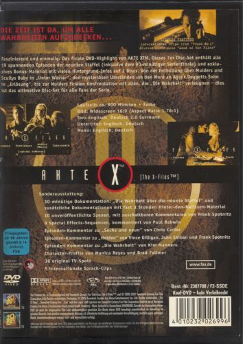 Das finale DVD-Highlight von AKTE X. Dieses 7er Disc-Set enthält alle 19 spannenden Episoden der neunten Staffel (inklusive dem 90-minütigen Serienfinale) und exklusives Bonus-Material mit vielen Hintergrund-Infos auf 2 Discs. Von der Enthüllung über Mulders und Scullys Baby in „Unter Wasser“, den mysteriösen Umständen um den Mord an Agent Doggetts Sohn in „Erlösung“, bis zur Mulders finalen Konfrontation mit allen, die „Die Wahrheit“ verleugnenBonus-Material: - 30-minütige Dokumentation: „Die Wahrheit über die neunte Staffel“ und zusätzliche Dokumentationen mit fast 3 Stunden Hinter-den-Kulissen-Material- unveröffentlichte Szenen, mit zuschaltbaren Kommentaren von Frank Spotnitz- 9 Special Effects-Sequenzen, kommentiert von Paul Rabwin- Episoden-Kommentar zu „Sechs und neun“ von Chris Carter- Episoden-Kommentar zu „Helden“ von Vince Gilligan, John Shiban und Frank Spotnitz- Episoden-Kommentar zu „Die Wahrheit“ von Kim Manners- Charakter-Profile von Monica Reyes und Brad Follmer- 38 original TV-Spots- internationale Sprach-Clips .