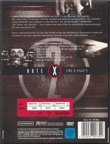 Die Suche geht weiter...Erleben Sie die komplette zweite Staffel von Akte X in einzigartiger DVD-Qualität.Alle spannenden 25 Episoden-Klassiker erstmals als exklusive Sammel-Edition. Von „Kontakt“, „Unter Kontrolle“ und „Seilbahn zu den Sternen“, bis „An der Grenze“, „Todestrieb“, „Der Zirkus“ und „Anasazi“ - hier erwartet den Akte X-Fan ein unheimliches Mystery-Ereignis der ganz besonderen Art.Dieses außergewöhnliche 7er-Disc-Set enthält einige der beliebtesten Filmszenen in vielen verschiedene Sprachen und eine vollständige Episoden-Liste aller sieben Staffeln.DISC 1:Kontakt (Little Green Man)Der Parasit (The Host)Blut (Blood)Schlaflos (SleeplessDISC 2:Unter Kontrolle (Duane Barry)Seilbahn zu den Sternen (Ascension)Drei (3) An der Grenze (One Breath) DISC 3:Der Vulkan (Firewalker) Rotes Museum (Red Museum) Excelsius Dei (Excelsius Dei) Böse geboren (Aubrey) DISC 4:Todestrieb (Irresistible) Satan (Die Hand, die verletzt)Frische Knochen (Fresh Bones) Die Kolonie - Teil 1 (Colony) DISC 5:Die Kolonie - Teil 2 (End Game) Sophie (Fearful Symmetry) Totenstille (Dod Kalm) Der Zirkus (Humbug) DISC 6:Heilige Asche (The Calusari) Verseucht (F. Emasculata) Das Experiment (Soft Light) Unsere kleine Stadt (Our Town) DISC 7:Anasazi (Anasazi) +Bonus-Material:- 15-minütige Dokumentation: „Die Wahrheit über Season Two“- Chris Carter spricht über 12 Episoden aus der Season Two- „Hinter den Kulissen“ Material über Gillian Anderson in „Zirkus“- Unveröffentlichte Szenen aus 4 Episoden- 9 „Wahrheit über Akte X“ Spots von F/X- Original TV-Spots