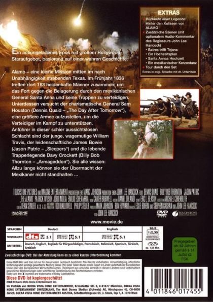 Ein actiongeladenes Epos mit großem Hollywood-Staraufgebot, basierend auf einer wahren Geschichte.Alamo – eine kleine Mission mitten im nach Unabhängigkeit strebenden Texas. Im Frühjahr 1836 treffen dort 183 heldenhafte Männer zusammen, um das Fort gegen die Belagerung durch den mexikanischen General Santa Anna und seine Truppen zu verteidigen. Unterdessen versucht der charismatische General Sam Houston (Dennis Quaid – „The Day After Tomorrow”), eine größere Armee aufzustellen, um die Verteidiger im Kampf zu unterstützen. Anführer in dieser schier aussichtslosen Schlacht sind der junge wagemutige William Travis, der leidenschaftliche James Bowie (Jason Patric – „Sleepers”) und die lebende Trapperlegende Davy Crockett (Billy Bob Thornton – „Armageddon”). Sie alle wissen: Allzu lange können sie der Übermacht der Mexikaner nicht standhalten ...