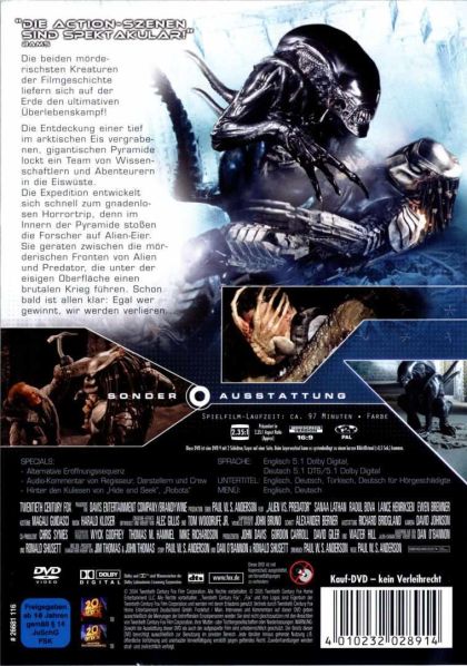 Die beiden mörderischsten Kreaturen der Filmgeschichte liefern sich auf der Erde den ultimativen Überlebenskampf!Die Entdeckung einer tief im arktischen Eis vergrabenen, gigantischen Pyramide lockt ein Team von Wissenschaftlern und Abenteurern in die Eiswüste. Die Expedition entwickelt sich schnell zum gnadenlosen Horrortrip, denn im Innern der Pyramide stoßen die Forscher auf Alien-Eier. Sie geraten zwischen die mörderischen Fronten von Alien und Predator, die unter der eisigen Oberfläche einen brutalen Krieg führen. Schon bald ist allen klar: Egal wer gewinnt, wir werden verlieren.