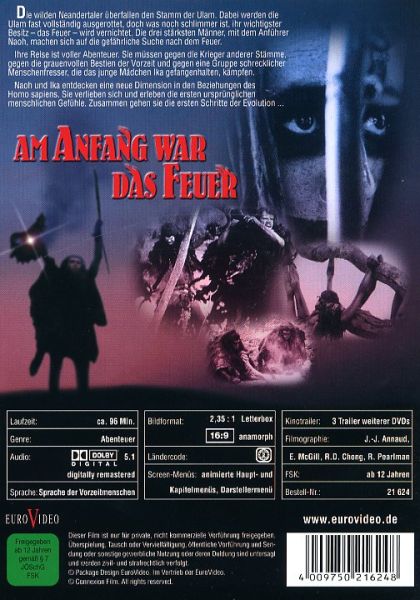 Die wilden Neandertaler überfallen den Stamm der Ulam. Dabei werden die Ulam fast vollständig ausgerottet, doch was noch schlimmer ist, ihr wichtigster Besitz – das Feuer – wird vernichtet. Die drei stärksten Männer, mit dem Anführer Naoh, machen sich auf die gefährliche Suche nach dem Feuer.Ihre Reise ist voller Abenteuer. Sie müssen gegen die Krieger anderer Stämme, gegen die grauenvollen Bestien der Vorzeit und gegen eine Gruppe schrecklicher Menschenfresser, die das junge Mädchen Ika gefangenhalten, kämpfen.Naoh und Ika entdecken eine neue Dimension in den Beziehungen des Homo sapiens. Sie verlieben sich und erleben die ersten ursprünglichen menschlichen Gefühle. Zusammen gehen sie die ersten Schritte der Evolution ...