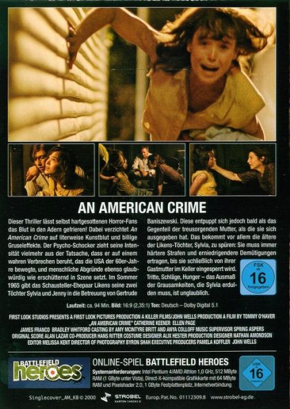 Dieser Thriller lässt selbst hartgesottenen Horror-Fans das Blut in den Adern gefrieren! Dabei verzichtet AN American Crime auf literweise Kunstblut und billige Gruseleffekte. Der Psycho-Schoker ziht seine Inensität vielmehr aus der Tatsache, dass er auf einem wahren Verbrechen beruht, das die USA der 60er-Jahre bewegte, und menschlich Abgründe ebenso glaubwürdig wie erschütternd in Szene setzt. Im Sommer 1965 gibt das Schausteller Ehepaar Likens seine zwei Töchter Sylvia und Jenny in die Betreuung von Gertrude Baniszewski. Diese entpuppt sich jedoch bald als das Gegenteil der treusorgenden Mutter, als die sich ausgegeben hat. Das bekommt vor allem die ältere der Likens-Töchter, Sylvia, zu spüren: Sie muss immer härtere Strafen und erniedrigendere Demütigungen ertragen, bis sie schließlich von ihrer Gastmutter im Keller eingesperrt wird. Tritte, Schlägem JHunger - das Ausmaß der Grausamkeiten, die Sylvia erdulden muss, ist unglaublich.