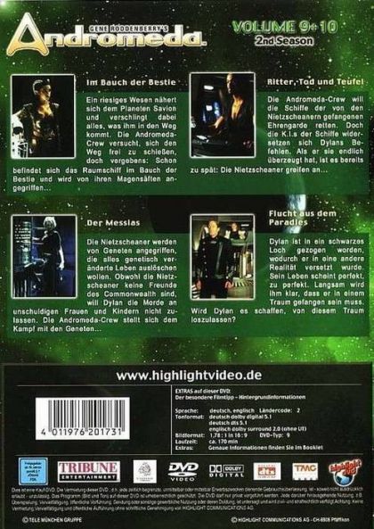 Im Bauch der BestieEin riesiges Wesen nähert sich dem Planeten Savion und verschlingt dabei alles, was ihm dabei in den Weg kommt. Die Andromeda-Crew versucht sich den Weg freizuschießen, doch vergebens: Schon befindet sich das Raumschiff im Bauch des Bestie und wird von ihren Magensäften...Ritter, Tod und TeufelDie Andromeda-Crew will die Schiffe der von den Nitzscheanern gefangenen Ehrengarde retten. Doch die K.I.s der Schiffe widersetzen sich Dylans Befehlen. Als er sie endlich überzeugt hat, ist es bereits zu spät. Die Nietzscheaner greifen an...Der MessiasDie Nietzscheaner werden von Geneten angegriffen, die alles genetisch veränderte Leben auslöschen wollen. Obwohl die Nietzscheaner keine Freunde des Commonwealth sind, will Dylan die Morde an de unschuldigen Frauen und Kindern nicht zulassen. Die Andromeda-Crew stellt sich dem Kampf mit den Geneten...Flucht aus dem ParadiesDylan ist in ein schwarzes Loch gezogen worden, wodurch er in eine andere Realität versetzt wurde. Sein Leben scheint perfekt, zu perfekt. Langsam wird ihm klar, daß er in einem Traum gefangen sein muß. Wird Dylan es schaffen, von diesem Treum loszulassen?