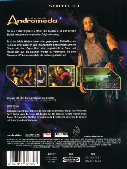 Dieses 3-DVD-Digipack enthält die Folgen 01-11 der dritten Staffel, inklusive der englischen Originalfassung.Er ist der letzte Wächter einer untergegangenen Zivilisation, ein Held aus einer anderen Zeit. Im Angesicht eines Universums im Chaos rekrutiert Dylan Hunt eine ungewöhnliche Crew und macht sich auf, die Galaxien wieder zu vereinigen. Mit dem Sternenschiff Andromeda lebt die Hoffnung wieder auf.