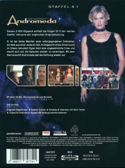 Dieses 3-DVD-Digipack enthält die Folgen 01 - 11 der vierten Staffel, inklusive der englischen Originalfassung.Er ist der letzte Wächter einer untergegangenen Zivilisation, ein Held aus einer anderen Zeit. Im Angesicht eines Universums im Chaos rekrutiert Dylan Hunt eine ungewöhnliche Crew und macht sich auf, die Galaxien wieder zu vereinigen. Mit dem Sternenschiff Andromeda lebt die Hoffnung wieder auf.